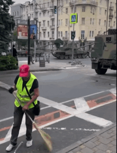 比如,一大早上醒來,瓦格納已經佔領羅斯托夫全城了,而羅斯托夫的清潔工就跟無事發生一樣,正常清掃大街。