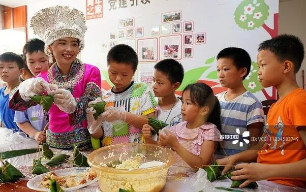 (在廣西壯族自治區南部的融水苗族自治縣,一名教師正在教學生如何包粽子。)