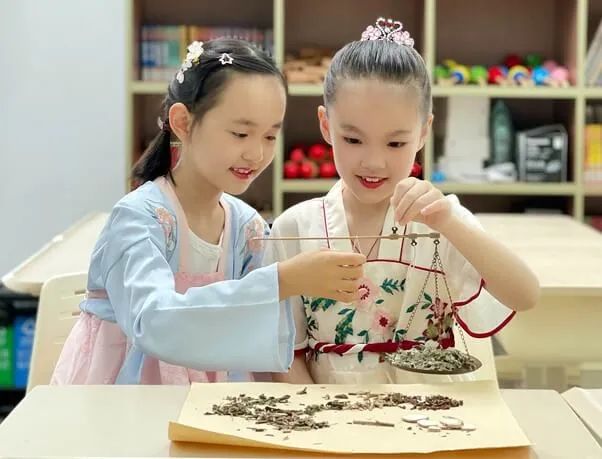 (江蘇省蘇州市的兩名女孩正在稱量製作香囊的傳統草藥。)