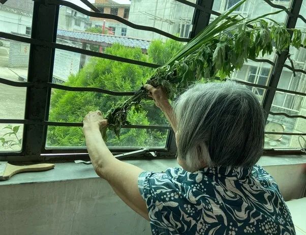 (浙江義烏的一位老奶奶正在把菖蒲和艾草掛在窗户上。)
