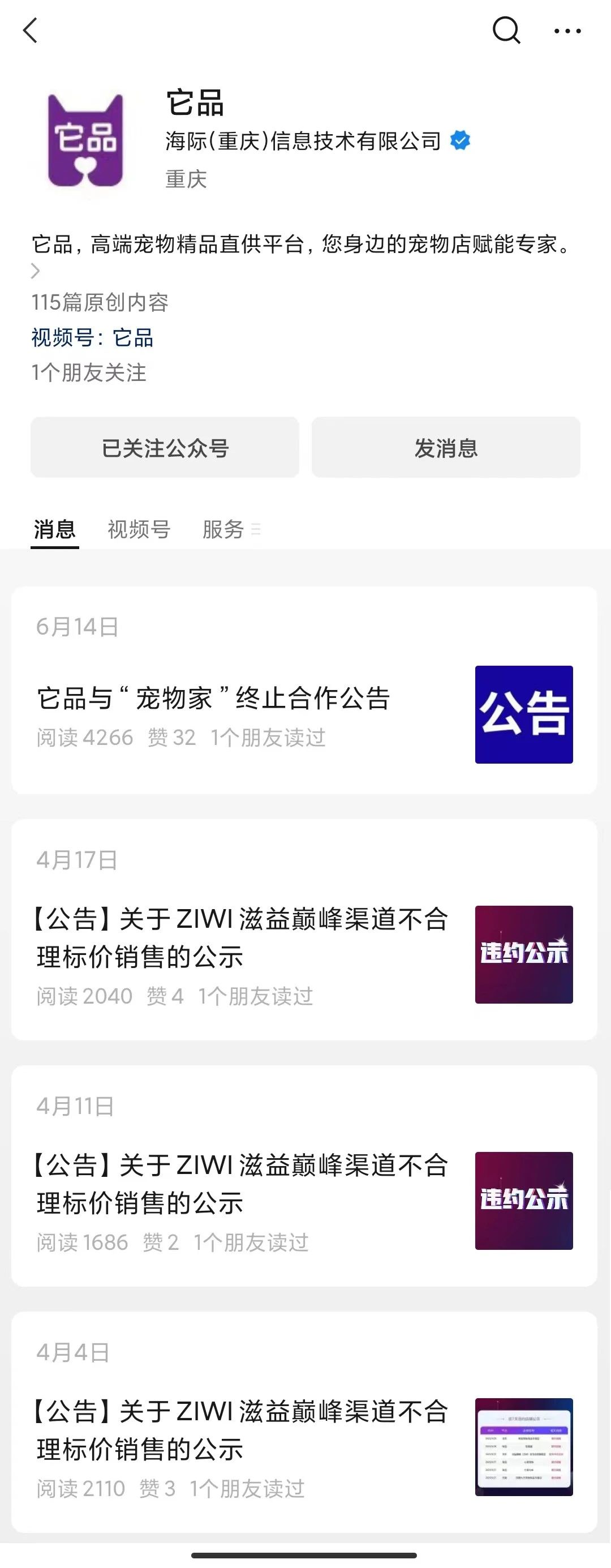 6月14日,主打“互聯網+進口寵物商貿”的海際它品在公眾號上發佈了公告,稱“近期,它品核實到客户‘寵物家’在較多渠道出售的ZIWI滋益巔峯產品價格低於在我司的進貨價,其‘惡性競爭’的行為極大地擾亂市場秩序和侵害其他商家的合法權益。”並宣佈,“它品已終止與寵物家ZIWI滋溢巔峯品牌的合作”。