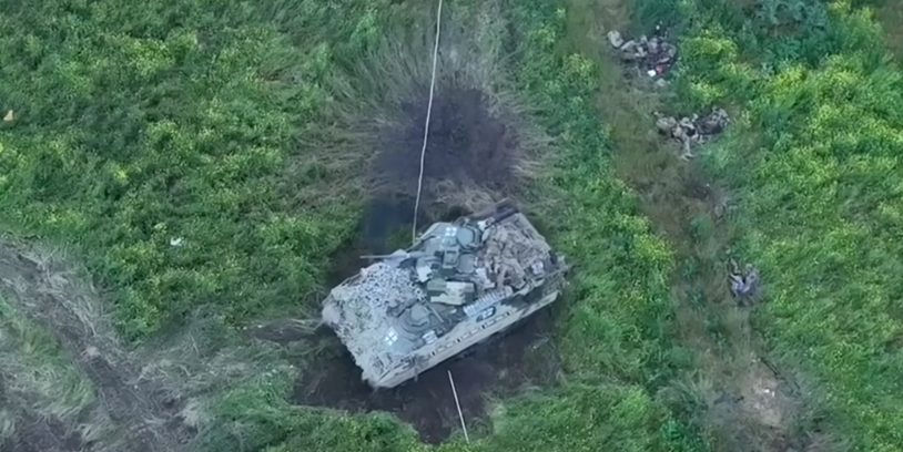 本來對於毛子的雷場沒什麼直觀概念,以為就是密密麻麻的反坦克雷還和人吐槽怎麼機械化步兵不下車。誰想新公佈的47旅進攻遭遇雷場時的視頻證明了毛子這雷場實在是不簡單,也難怪47旅會在雷場面前損失慘重。這段11分鐘的視頻可以看出來是一個非常典型的用布萊德利的機械化步兵班(布萊德利一個班兩輛車),光是視頻裏面可以看到的傷員就有5+2(5人原先被炸傷,2人救援時踩雷),這個機械化步兵班等於徹底喪失戰鬥力了。