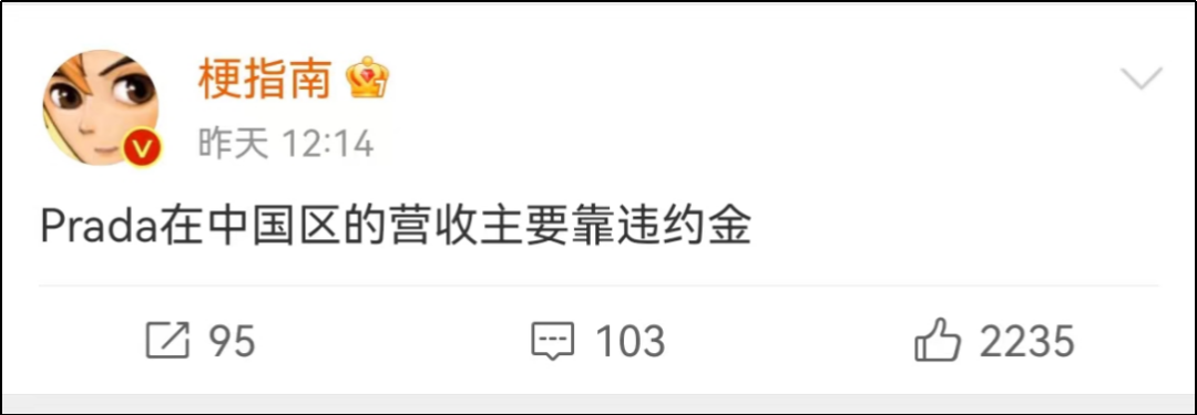 但按照網友段子裏説的,除了形象稍有小污點,Prada賺違約金都賺麻了吧。