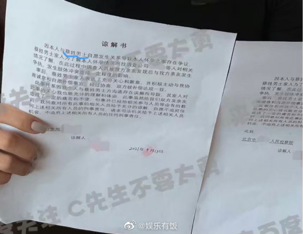 原來比蔡徐坤大9歲的C女士發現被跟蹤監控後報警,隨後蔡徐坤和他母親被警方傳喚。雙方簽下和解的諒解書。