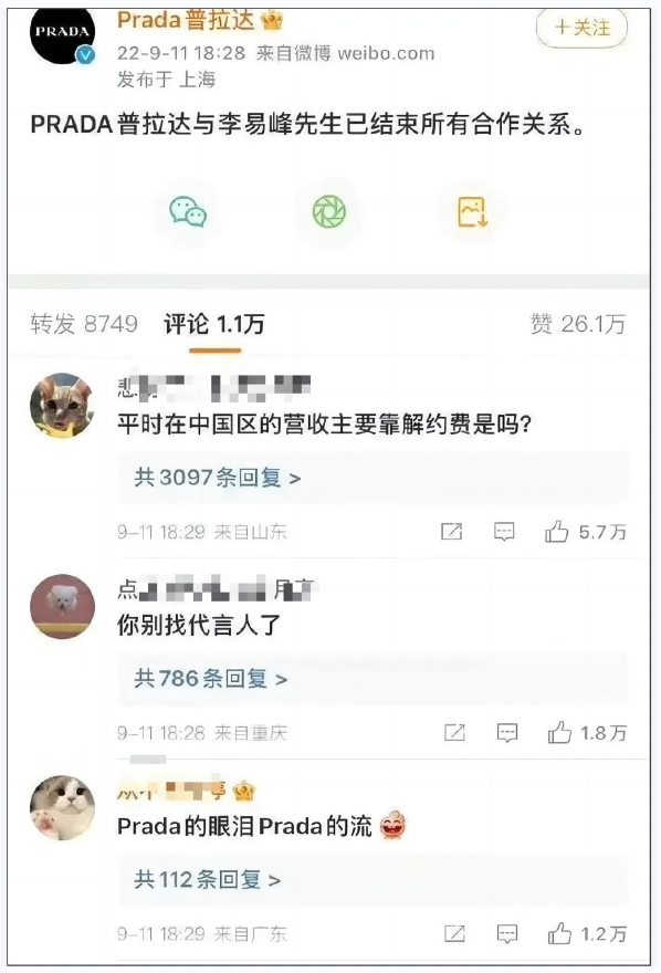 李易峯塌房後,Prada微博的評論區淪陷了。