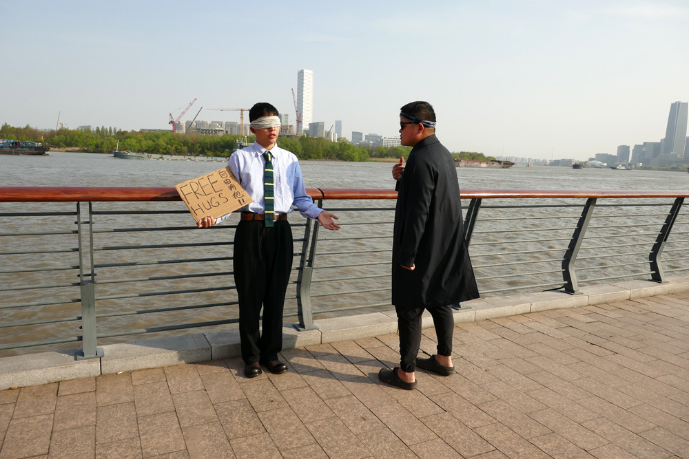 這小夥在這裏Free Hug,半天等來這人,他研究了半天,也沒有hug,掉頭走了