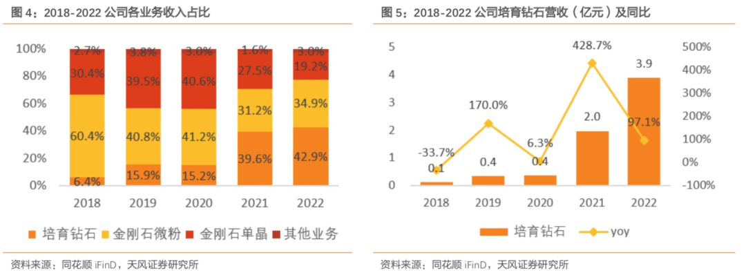 拆分來看,培育鑽石是拉動力量鑽石業績增長的主力,2021年和2022年分別同比增長428.7%、97.1%,佔總營收四成左右。