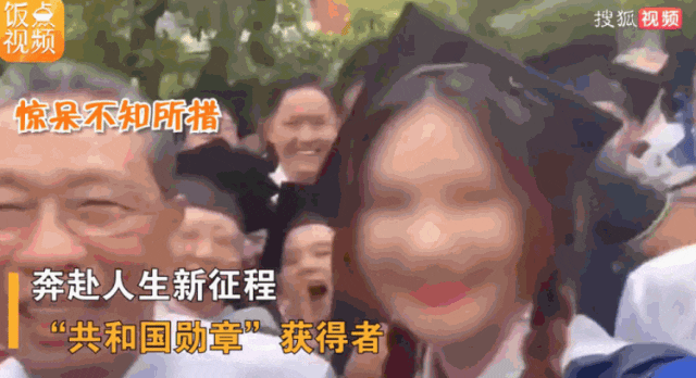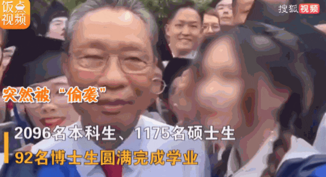 在畢業典禮前的畢業合照環節中,一名研究生畢業的女同學站在鍾南山身旁,化着精緻妝容,突然親了一口鐘南山側臉。