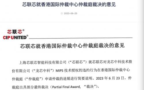 2023年6月25日,據上市公司龍芯中科技術股份有限公司(簡稱“龍芯中科”,股票代碼688047)發佈關於《仲裁事項進展的公告》,關於龍芯中科與芯聯芯的知識產權糾紛迎來了最新進展——據其公告顯示,香港國際仲裁中心仲裁庭於6月23日簽發了《部分最終裁決書(HKIAC/PA21030)》,認定龍芯中科需向芯聯芯賠償。