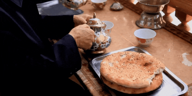 饢的麥香與奶香在空氣中氤氲開來,刺激着每一位客人的嗅覺,引誘他們停下腳步,路過茶几的人都忍不住拿起一小塊切好的饢,或是幹吃,或是泡奶茶吃,亦或是抹上酥油或果醬吃。