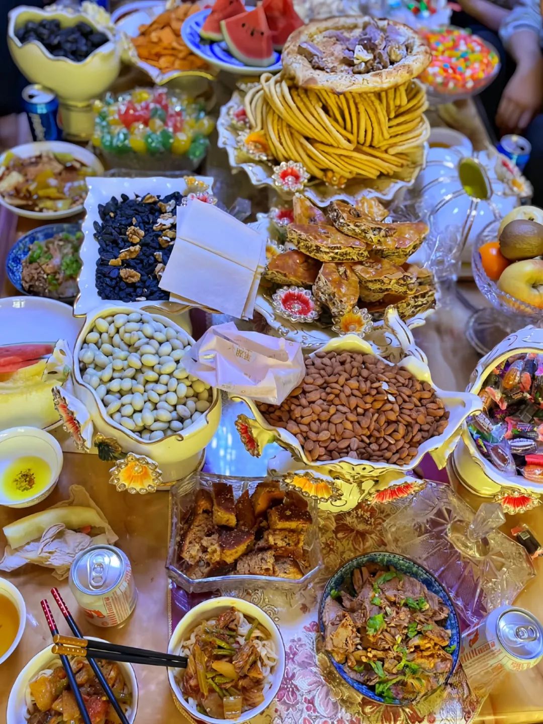 臨近古爾邦節,我跟隨朋友去了她家,裝修是典型的新疆風格——豪華的玻璃吊燈、帶有複雜紋樣的手工地毯、櫥櫃裏各種花色的裝飾品,還有鋪着流蘇桌布的加長版餐桌。