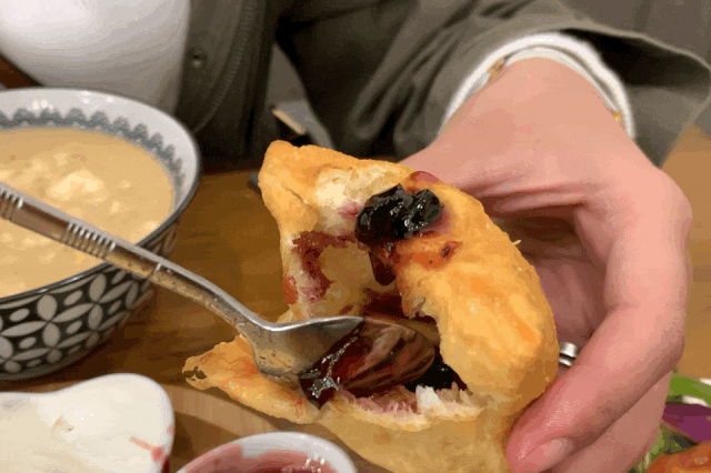 油炸的包爾薩克有着不同的形狀:厚實的球狀、實心的長條狀……最常見的還是四邊形的,酥酥的包爾薩克還帶着一點奶味的香甜,吃得人滿口留香。