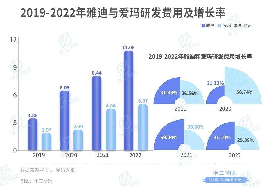 在研發投入方面,據雅迪財報顯示,2019-2022年,其研發費用分別為3.86億元,6.05億元,8.44億元,11.06億元,分別同比增長31.33%,21.32%,69.04%,31.10%;據愛瑪財報顯示,2019-2022年,其研發費用分別為1.97億元,2.39億元,4.04億元,5.07億元,分別同比增長26.56%,56.74%,39.50%,25.39%。