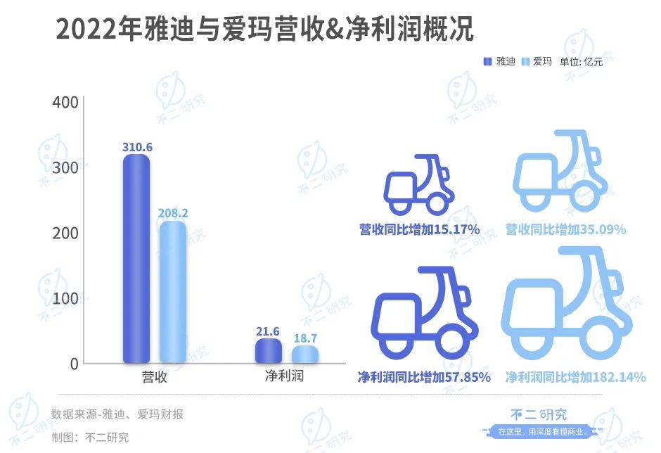 「不二研究」據兩家電動車企年報發現:2022年,愛瑪營收為208.2億元,同比增長35.09%;淨利潤為18.73億元,同比增長182.14%。同期,雅迪營收為營收310.59億元,同比增長15.17%;淨利潤為21.61億元,同比增長57.85%。