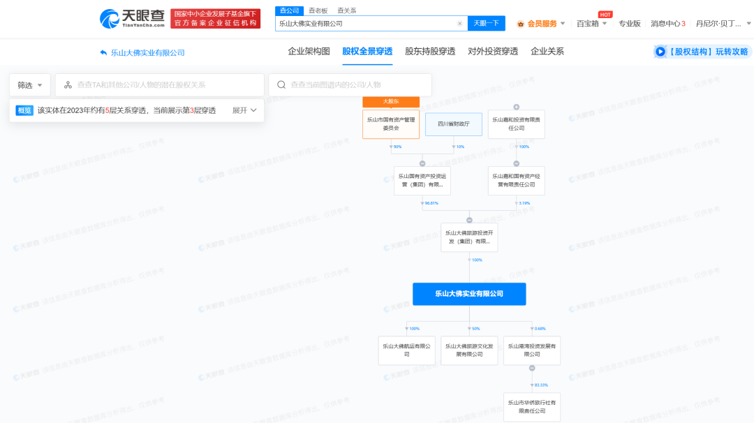 天眼查App顯示,樂山大佛實業有限公司成立於1999年6月,註冊資本2億元,經營範圍包括餐飲服務、遊藝娛樂活動、住宿服務、遊覽景區管理等。股權全景穿透圖顯示,該公司由樂山大佛旅遊投資開發(集團)有限公司全資持股,後者控股股東為樂山國有資產投資運營(集團)有限公司。