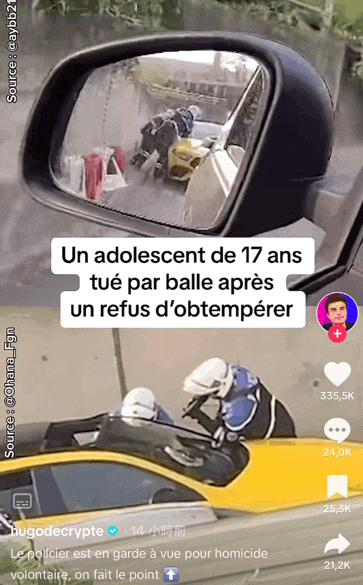 按法媒的説法,網友覺得視頻和警方所説是矛盾的,因為視頻裏顯示車子停着,兩名警察在進行檢查,其中一名警察站在車窗旁,拿着槍直接指着司機。當司機啓動車的時候,警察從側面近距離直接開槍了。