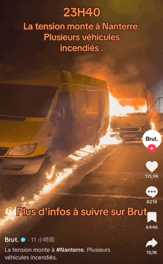 用法媒的話説,晚上事情就已經發展到,整個法國多個城市都被點燃,包括科爾馬,波爾多,馬賽,各地的暴亂者抓住機會和警方發生衝突,一直持續到了深夜。