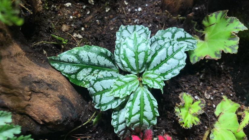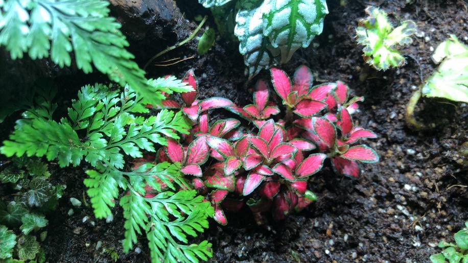 在靠前的位置,可以種植一些網紋草和超級迷巖。網紋草的葉片花色很多,可以選擇 2-3 種不同的品種,將它們混搭一下,會為你的雨林缸增添不少色彩。而超級迷巖則是雨林缸中的開花能手,狀態好的話幾乎四季都有可愛的喇叭形花朵開放,也是點綴雨林缸的好幫手。