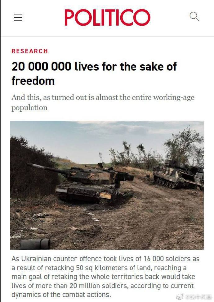 Politico:由於烏克蘭反攻行動奪回了50平方公里的土地,導致1.6萬名士兵喪生,根據目前的戰鬥情況,要實現奪回全部領土的主要目標,將需要兩千萬士兵生命。