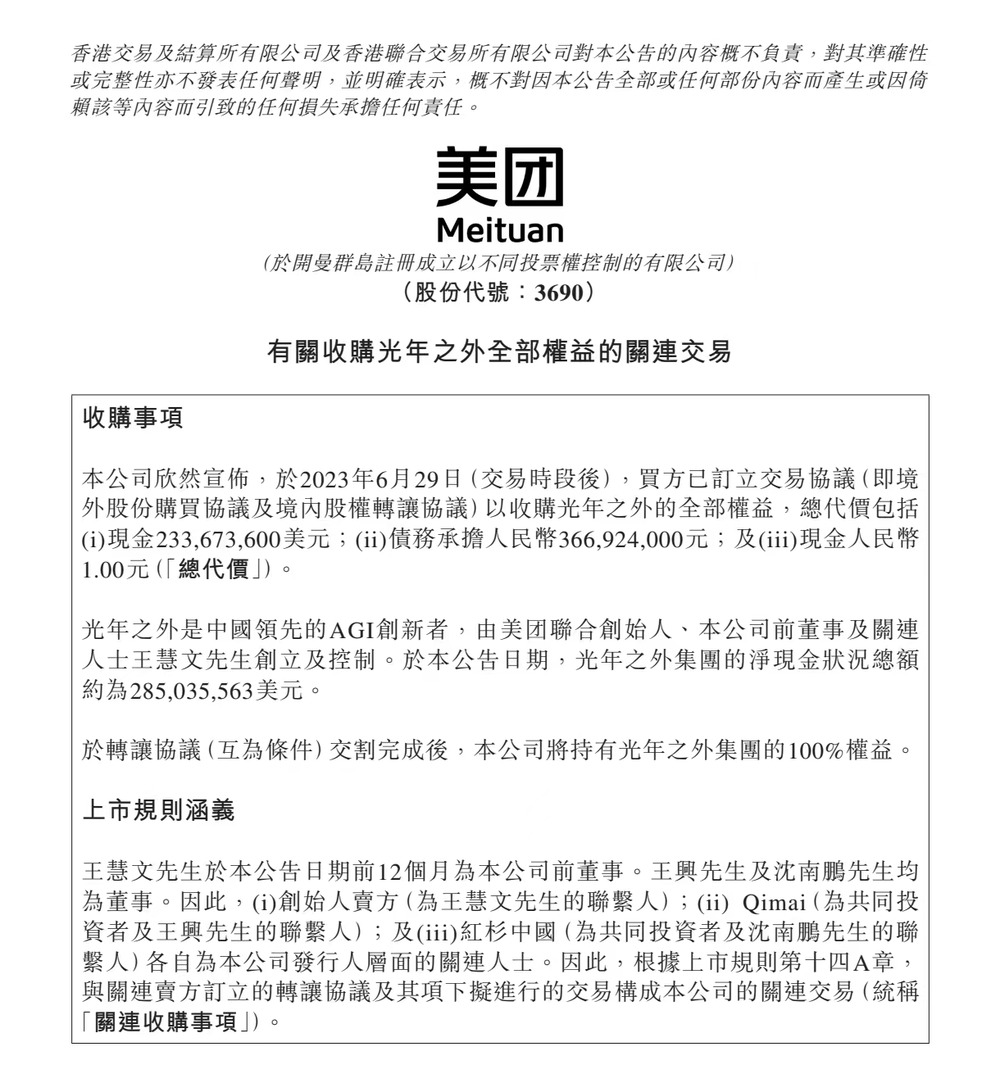昨天下午,美團在港交所網站宣佈,已訂立交易協議收購光年之外的全部權益,總代價包括現金233,673,600(2.3億)美元;債務承擔人民幣366,924,000(3.7億)元;及現金人民幣1.00元。
