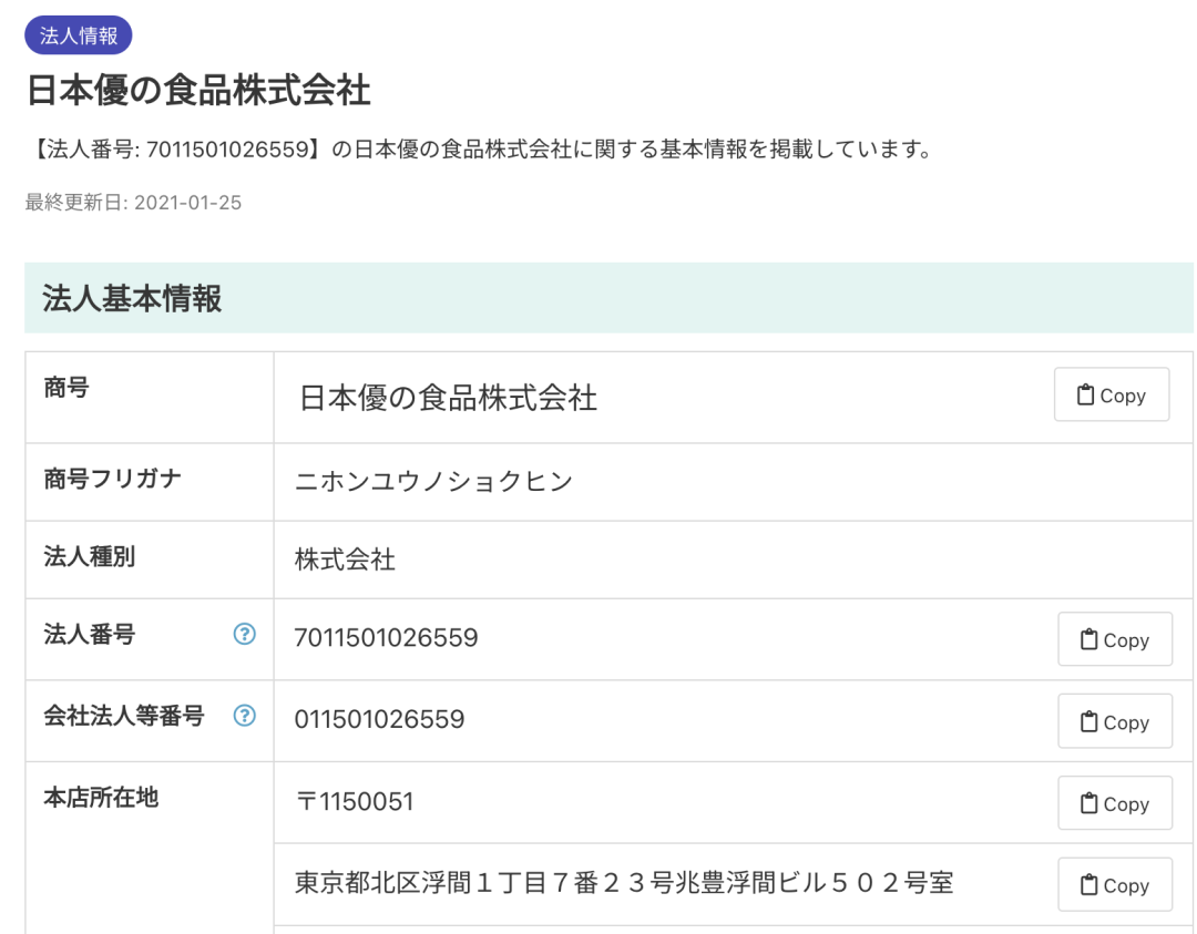 不過,這個“日本優之食品有限公司”,也就是產品包裝上的“日本優の食品株式會社”,日本確實有這麼一家公司,經營地址也對得上。