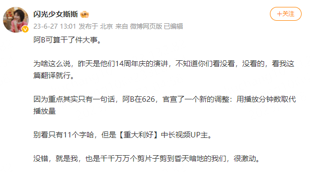 中長視頻UP主對這個改動也普遍給出了積極反饋,比如我的朋友,閃光少女斯斯也説,怎麼把自己平台內的用户服務好、怎麼讓規則更公平、怎麼激勵更多人創作出優質的內容、怎麼給用户看到更好的內容的外化表現,才是正經事。