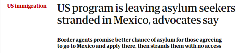 近幾周來,許多人選擇了“自願遣返”。然而,在被美國政府帶過邊境後,他們在沒有接到任何警告的情況下,最終被墨西哥政府運到了該國南部塔巴斯科州(Tabasco)等地。被遺棄在那裏的申請庇護者往往身無分文,並發現無法進入美國政府的庇護申請程序。