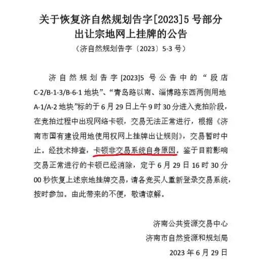 70分鐘後,也就是11點27分,濟南土儲中心先線下通知大家:系統頁面卡頓問題正在檢測原因,等恢復並檢測穩定了會恢復競拍,具體時間另行通知。