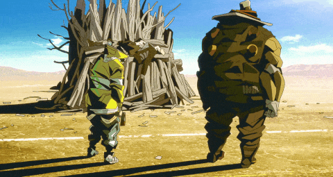 最後,大衞依然前來營救被敵人包圍的曼因,卻只能選擇自己逃跑,在爆破來臨前,一個極快速的大搖攝甚至可以説狂暴地掃過曼因的幻覺世界[Gif 7.3],在轉瞬間攝入沙漠的跑道盡頭拖着長長的影子的曼因,與跑道的彼岸在無盡荒蕪中背對曼因逃離的大衞以及遠空,是充分地展示五十嵐海的運動性的鏡頭。然後,巧妙地一瞬插入大衞倉皇逃離的背影的靜止畫[Gif 7.3],沙漠的那頭,不知怎地是奇異的荒野。本話的最末,在這裏未能完全記述的一連鏡頭,毫無疑問是五十嵐海風格的一次出類拔萃的展覽。