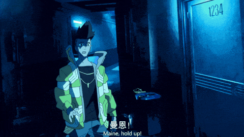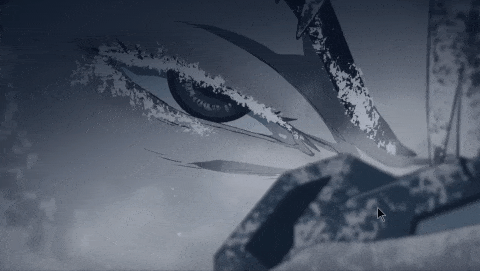 比方説,《古立特》第九話新條茜墜落的場景中,描繪她在雨後、在潮濕的霧氣裏鬆鬆垮垮的衣服那破碎、扭結的線[Gif 10.1],《電光機王》第十話海岸的山中歷與稻本那場戲,彷彿能讓我們感到暢快的海風撲面而來一般飄揚的頭髮與衣褶自由舒展、彼此牽扯的線[Gif 10.2],《賽博浪客》第六話在幻象的沙漠裏刻畫大衞的頹唐與曼因如雕塑般的沉靜,彷彿漿好熨直的衣料般讓我們感覺到乾燥的、硬質的線[Gif 10.3]。沒錯,五十嵐海動畫的線承受着環境所施加的情動,會在不意間表象出空氣與身體的接觸與混合。