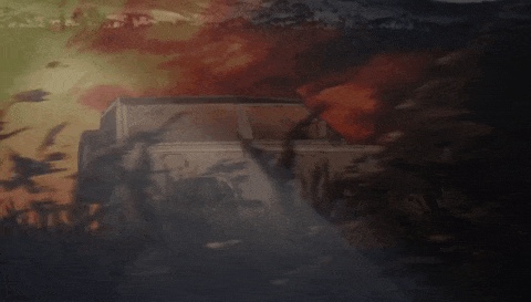 《天國大魔境》第十話的最後,以突如其來的復仇,他親手冷靜地斷絕了自己的歸途,重新踏上流浪的旅程。剎那間,畫面切到一個同樣是從疾馳的車內向前窗玻璃仰拍的固定鏡頭[Gif 8.2],可是,現在像血一般濃重的暮雲快要壓過來,後視鏡卻奇怪地不見人影,原本理當在這裏的觀看者都不再存在的畫面一瞬給予了我們一種疾走的虛無感,在本該穩定的鏡頭裏生出前途未卜的、決定性的不穩,再一次擊穿了我們的預期②。面對才華橫溢的五十嵐海又一次製作出的如此令人驚異的作品,我們只能在心裏默默地期盼,期待他執導長篇動畫電影的時代的到來。