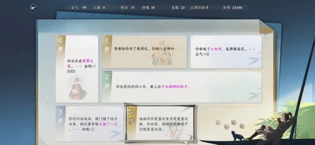 遊戲裏還有很多被戲稱為“4399”的小遊戲——比如“混江湖”玩法,是一個內置的文字遊戲。玩家可以隨機出幾個屬性,選好人生天賦,然後開始一歲一歲地在説書人的故事裏度過這輩子。可正當我以為這是個類似於很久之前很火的《人生重開模擬器》的遊戲時,它又突然變成了一個文字冒險遊戲。