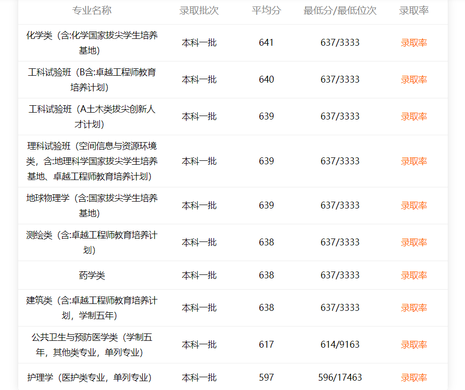 然後看看武大收分最低的專業,是兩個單列專業,公共衞生和預防醫學類,最低排名9100名左右,護理類就不用説了,這是特殊專業。武大其它專業沒有任何一個收分低於3333名。