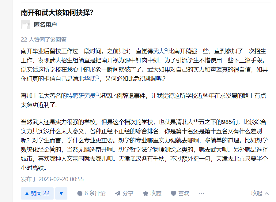 當然後面説南開在下滑就見仁見智了,但也稱不上詆譭吧?清華北大互相搶狀元的時候,也會互相説對方一點壞話啊,清華要是説北大工科不行,料想北大也沒法反駁吧?