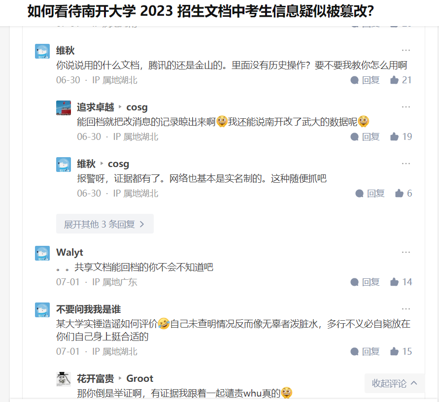 但是2023年這些指控就有點厲害了,説是黑了南開招生共享文檔,把招生組辛辛苦苦收集的資料給篡改了…….