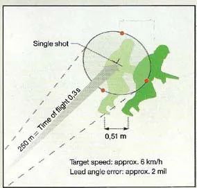 ▲“在有限的研究中……我們發現三發點射可能不是最佳的點射數量。在大多數用兩腳架支撐的固定射擊時,進行5到10發的點射,第三發會到達散佈的邊緣,隨後的幾發將回到圍繞初始瞄準點的較小的散佈規模。因此對目標進行5到6發的點射,可能會增加命中概率,而不是兩次3發點射……”