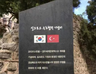 “紀念2013伊斯坦布爾-慶州世界文化世博會開啓,為絲綢之路的起點和終點的大韓民國慶尚北道和土耳其伊斯坦布爾的永遠的友情,特立此碑。”