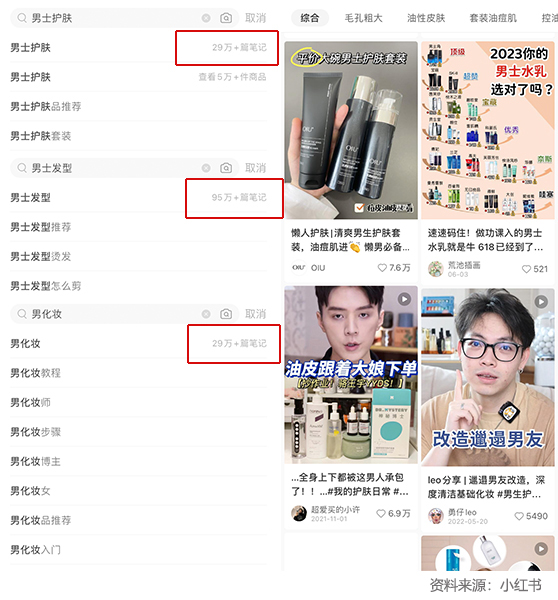 小紅書平台上,圍繞男士造型、護膚、化妝等話題的筆記數超過153萬篇,且熱度仍持續攀升,男性美妝博主的數量也與日俱增。