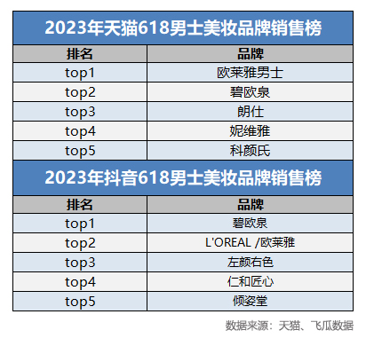 此外,在去年的618購物節中,天貓平台上的男士護理產品整體銷量實現20倍的高速增長**。今年618大促中,天貓平台男士美妝品牌累計GMV排行榜第一名仍然是常年霸榜的[歐萊雅男士]。抖音電商618男士美妝品牌銷售榜位列第一的是法國品牌[碧歐泉],前五名中不乏新晉的國貨美妝品牌如[左顏右色]、[仁和匠心]、[傾姿堂]**。