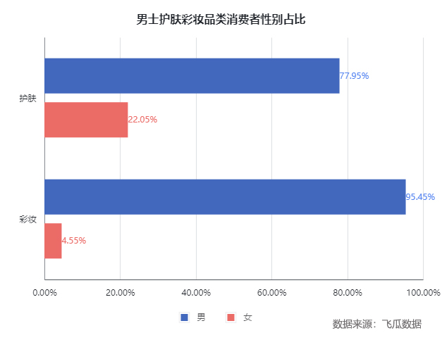 男士護膚品類中,女性消費佔比22.05%,男性佔比77.95%;男士彩妝產品消費者中也有4.55%為女性。