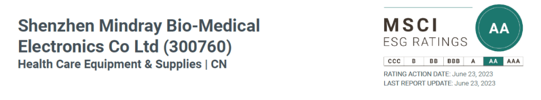 近日,國際權威評級機構摩根士丹利資本國際公司(Morgan Stanley Capital International,簡稱MSCI)公佈了邁瑞醫療最新ESG(Environmental, Social and Governance,即環境、社會和管治)評級結果,由BB級躍升至AA級。這是A股上市公司所獲得的最高ESG等級評級,標誌着邁瑞醫療邁向全球醫療器械行業企業ESG治理領先水平。