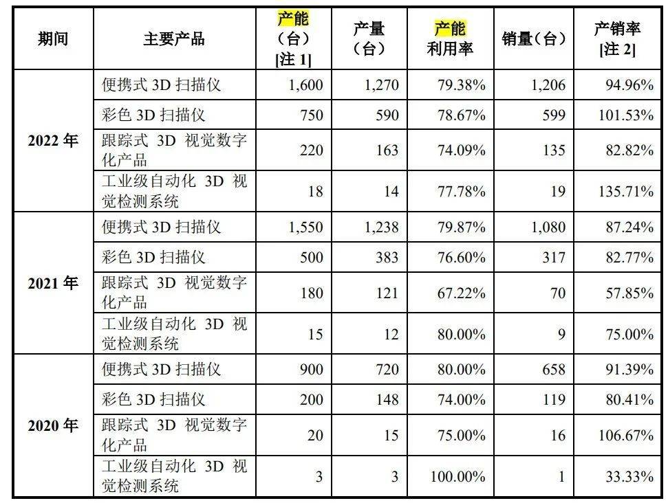 招股書顯示,2020-2022年,彩色3D掃描儀產能利用率分別為74%、76.6%、78.67%。