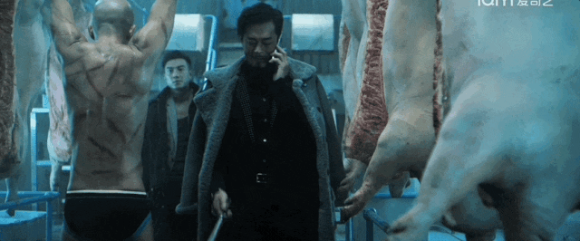 《掃毒2》裏,地藏(古天樂 飾)身披毛呢大衣,穿過吊生豬的冷庫。