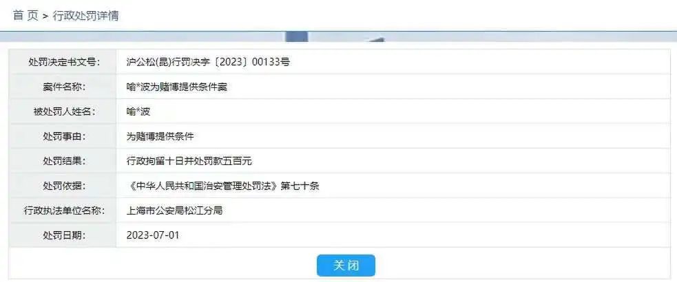 與此同時,網上開始流傳一張上海松江公安公示的行政處罰詳情圖,案件名稱為“喻X波為賭博提供條件案”。由於松江公安公佈的信息中並不會顯示全名,因此不少網友便結合LPL推遲開票疑似要調整賽程的舉動,迅速將該行政處罰人員和滔搏俱樂部ADC選手喻文波(遊戲ID:JackeyLove)聯繫在了一起。