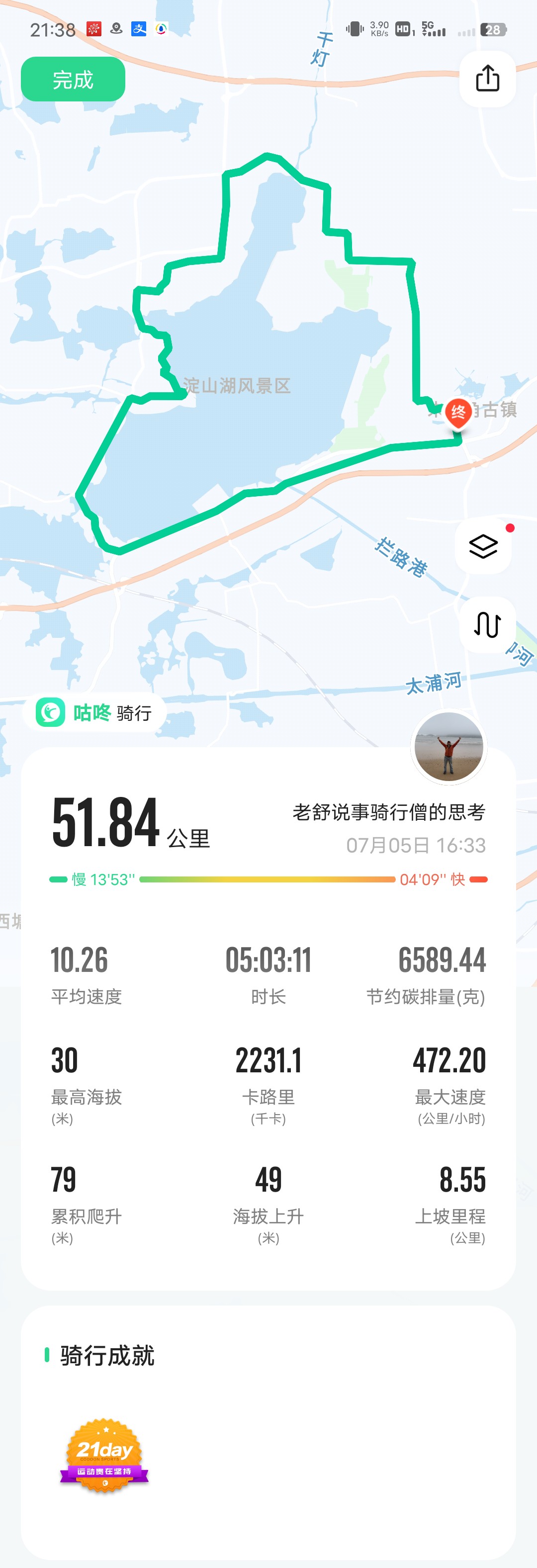 第一次環澱山湖騎行總的感覺還不錯,沒有拉跨到回家就躺平的狀態,平時常常騎行的體能儲備也是很重要的。高温酷暑能有這樣成績我給自己打80分吧!