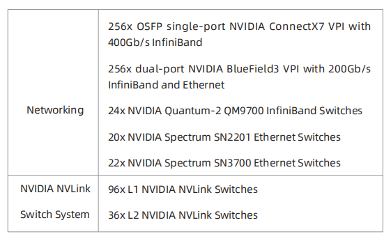 如果需要更大規模(超過256個GPU)的集羣就需要引入InfiniBand交換機。對於Grace Hopper超級芯片的大規模集羣NVIDIA建議採用Quantum-2交換機組網提供NDR 400 Gb/s端口。每個節點配置BlueField-3 DPU(已集成ConnectX-7),每個DPU提供2個400Gb/s端口,總帶寬達到100GB/s。理論上使用以太網連接也可以達到類似的帶寬水平,但考慮到NVIDIA收購Mellanox,傾向於使用InfiniBand是可以理解的。