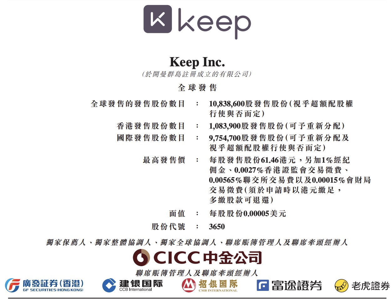 6月30日,港交所公告顯示,Keep於今日起至7月5日招股,計劃全球發售1083.9萬股。其中國際發售975.5萬股、中國香港發售108.4萬股,發售定價區間為每股28.92-61.46港元,另有15%的超額配股權。中金公司為Keep此次上市保薦人,預期股份將於7月12日開始在香港聯交所買賣。