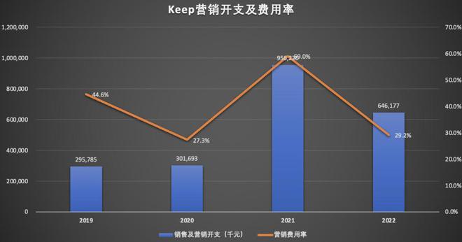 2019年至2022年,Keep銷售及營銷開支分別為2.96億元、3.02億元、9.56億元和6.46億元,營銷費用率分別為44.6%、27.3%、59%和29.2%。