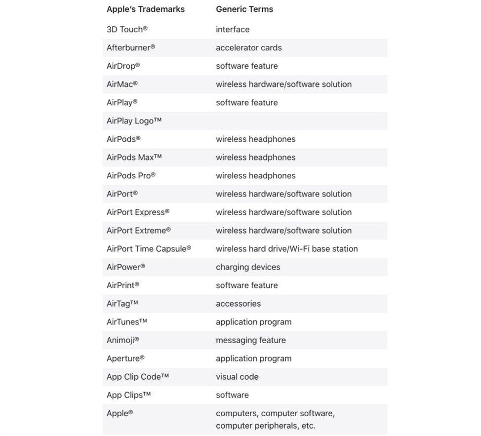 比如在蘋果官網上有一個清單,這上面有各種東西的商標和對應的話術,包括了軟件、硬件、功能、技術等,也就是説蘋果的話術,是建立在自身足夠有料的前提上。