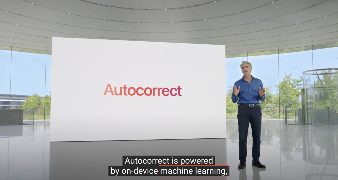 再比如 “AI”,蘋果在 iOS 17 上,給鍵盤內置了全新的語言模型,可以自動糾正拼寫錯誤的詞,這明顯是跟 AI 有關的,但蘋果卻用了 “ 機器學習 ” 這個詞來代替 “ AI ” 。